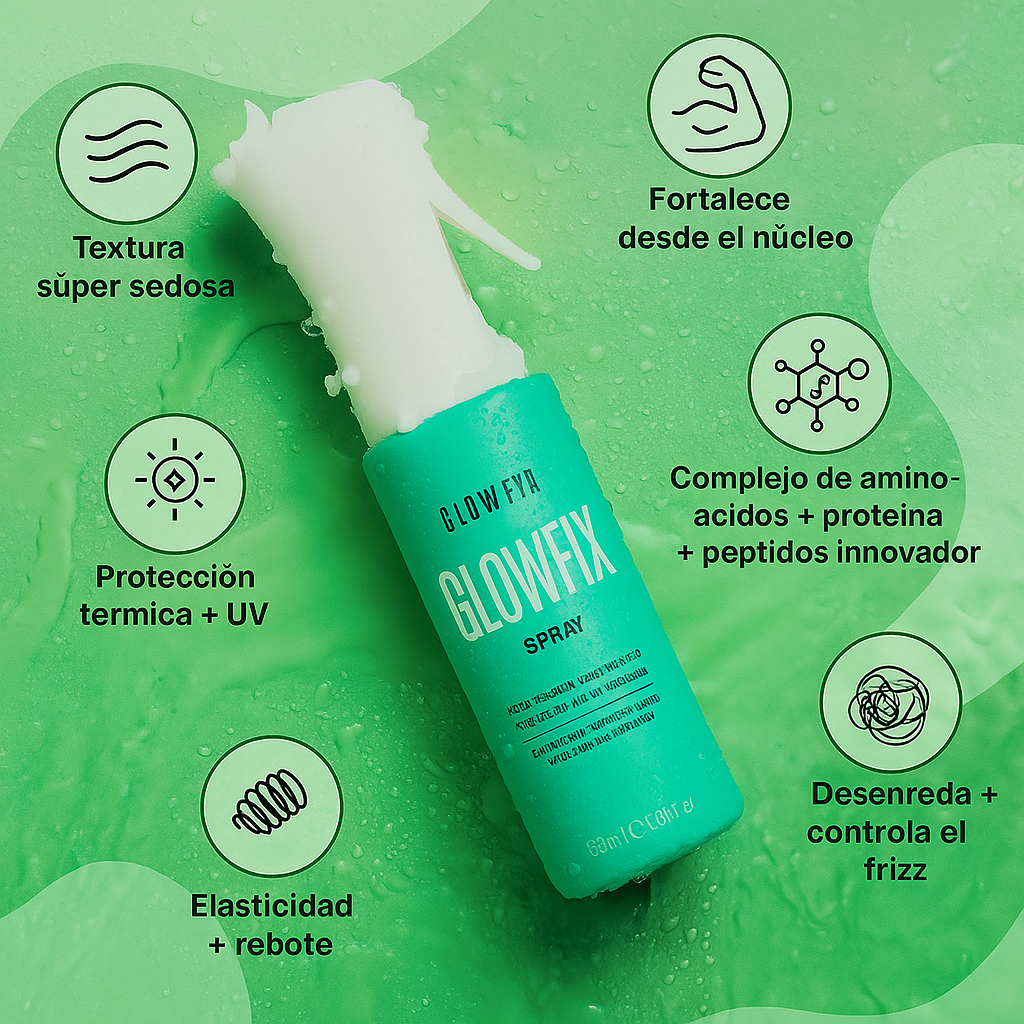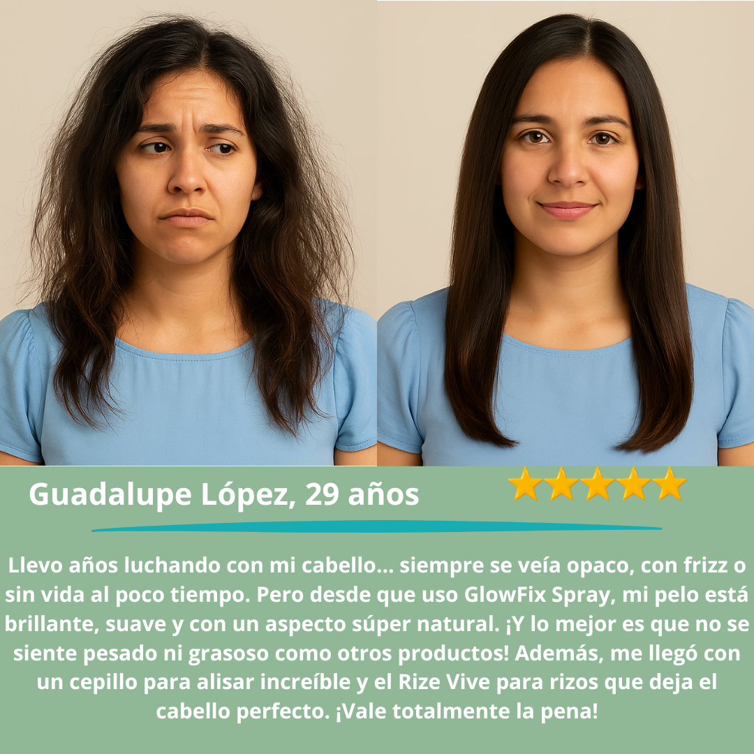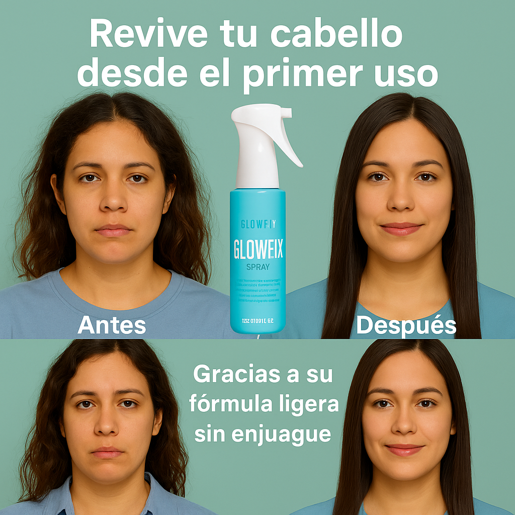Descubre el secreto para un cabello liso, brillante y sin frizz. GlowFix Spray combina ingredientes premium como aceite de argán, queratina y aloe vera para nutrir y transformar tu melena desde la primera aplicación. Más de 10.000 mujeres ya presumen de un cabello suave y radiante en minutos.